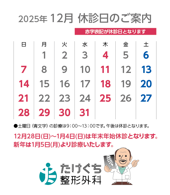 誠に勝手ながら、たけぐち整形外科では下記期間を年末年始休診と致します。